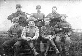 Эту фотографию принес в редакцию Степан Сафронович Альберт. Он рассказал, что на фото крайний слева в первом ряду — его дядя Степан Федорович Альберт. Снимок родные получили в конце…