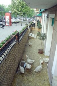 Это не слуховые галлюцинации, а самые настоящие живые гуси, которых, для дополнительной, надо полагать, рекламы, завели в одном респектабельном ресторане. И теперь посетители ресторана могут наблюдать, как гуси важно прогуливаются за стеклом.