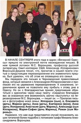 Как старший в роду Воронцовых и прямой потомок Михаила Семеновича Воронцова, от всей души хочу выразить свою признательность Черноморскому православному фонду и Одесскому городскому Cовету за перезахоронение праха…
