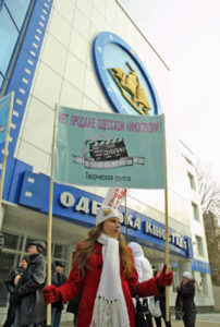 Возле здания Одесской киностудии 4 января ее работники провели акцию протеста против продажи предприятия, передает корреспондент ИА «Контекст-Причерноморье».