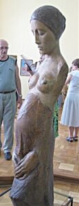 …Не зря одна из центральных на выставке композиций так и называется: «Ожидание (Беременная)»: деревянная скульптура, изображающая юную обнаженную завтрашнюю мать, с потупленным взором скорбного, почти иконного, лица, сосредоточенного, замкнутого, погруженного в тайну, — это произведение сегодня выглядит программным, хотя в наследии художника относится к ранним. Сегодня многие одесситы считают, что моделью послужила жена художника Елена. Однако Елена Степанова, директор салона ОО НСХУ «Художник», сказала мне на это: «Ничего подобного! «Беременная» была создана за два года до нашего знакомства с Николаем. Он тогда был в Прибалтике, в Паланке, на симпозиуме, и увидел выставку деревянной скульптуры Полесья. Очень она его впечатлила, и он тогда много работ из дерева сделал. Эта поездка была у него сразу после окончания художественного училища. Но после… оказалось, что «Беременная» на меня похожа!».