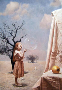 «Символы жизни», «Исповедь музы», «Образы времени», «Загадка иллюзиониста» — название каждой картины Сергея звучит приподнято, чуть-чуть заумно, словно название какого-нибудь арт-хаусного кинофильма. Однако не будем забывать, что в живописи далеко не всегда нужны какие-то словесные обозначения. Главное, мастерства Сергею не занимать, некоторое влияние сюрреалистических грез Сальвадора Дали (все эти яйцеобразные формы, циферблаты часов, пустынный фон) сочетается у него с фирменной «русской обманкой», с высококлассным, тонким письмом. Ощущения вторичности, заимствования не возникает, настолько избранная манера соответствует внутреннему миру автора. Для него эта особая среда совершенно естественна!