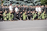 А затем на плацу училища началось настоящее военное шоу: выступили юные каратисты, была показана условная контртеррористическая операция. Выпрыгнувший из засады спецназ под аплодисменты публики молниеносно уложил «экстремистов» на асфальт. И звучала песня-слоган: «Раз, два, три, ми нащадки козакiв Богдана — ми шануємо славу батькiв».