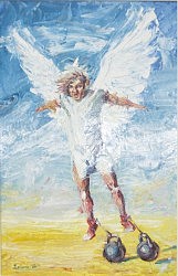 — Георгий — человек-театр, человек-мотор, — дополняет искусствовед Ирина Тимохова. — Он не может хранить верность одной музе, зато хранит верность одной галерее… И тот факт, что он показывает свои работы в этом камерном пространстве, говорит нам: автор не стремится создать из своей выставки медиа-событие. Прошло уже десять лет со дня открытия его первой выставки. Живопись, конечно, хобби Георгия, и мы видим, как от первых живописных гэгов, приколов замечательных он приходит к рассказу о сокровенном. Это исповедь неисповедимого, это состояние души. Ему, постоянно окруженному суетой, хочется удалиться в пустыню, погрузиться в медитацию, это ощущается в картинах. Пабло Пикассо сказал однажды: «Живопись — это выход из положения». Так и здесь. Все эти опутанные ангелы, образы которых можно трактовать различным образом, кажутся мне душой Георгия, которая рвется в небо, но в то же время так привязана к земле…