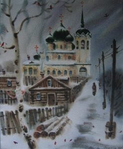 В этом смысле изумительно проникновенны два лирических пейзажа, посвященные Старой Ладоге: «Дождь уходит» (мотив воды) и «Зима» (мотив снега), на которых, как я поняла, запечатлен один и тот же старинный храм, в отдалении и вблизи. Особенно удался зимний мотив: строгий, цельный, лаконичный, пронизанный тревогой и радостным ожиданием, которые всегда сопутствуют первому снегу. Может быть, причиной тому преобладание в композиции вертикалей — храмового силуэта с колокольней, убегающего ряда телеграфных столбов, заборного штакетника, деревца на первом плане. В «водном» мотиве — разлив всего и вся по горизонтали, побуждающий к задумчивой созерцательности.