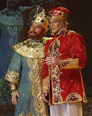 Удивил яркой ролью Шута заслуженный артист Украины Геннадий Скарга — в родной русской драме он больше играет современных героев, жестких, нервных, ироничных, а тут больше раскованности, юмора. Достойно проводит роль капризного Царя актер Театра юного зрителя Сергей Юрков — именно его персонаж и закручивает интригу. По его повелению все и начинается! Заслуженная артистка Украины Юлия Скарга в роли Купеческой дочки — просто ураган какой-то, ее героиня успевает и козни Василисе состроить, и покорить зал отрицательным обаянием. И все это под музыку, подобранную Константином Пенчковским, с хореографией Сергея Кочергина (он же, как своеобразный «играющий тренер», занят в роли Кащея Бессмертного), ярко, динамично, и когда спектакль вдруг заканчивается, детям и взрослым хочется продолжения…