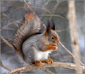 Всю теплую осень белка-цокотуха приходила к нам из парка Победы на балкон второго этажа. К зиме, но довольно рано, мы соорудили кормушку для синичек и…