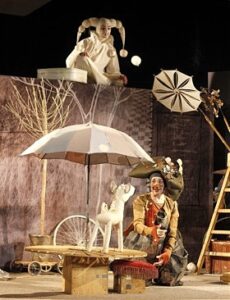 Режиссер спектакля, художественный руководитель Киевского Театра марионеток Михаил Яремчук и художница из Ужгорода Леся Лучко показали коллегам и друзьям важный этап своей работы, который покорил тонким эстетизмом и поиском глубинных перекличек форм и содержания. Карусель, балаган, сладкая вата (в виде шариков, напоминающих снежки, а порой и яблочки «белый налив») противопоставлены вольному лесу с его цветами, деревьями и бабочками. Напомним, что болгарский драматург Рада Москова написала пьесу «Куда ты, Жеребенок?» еще в советские времена, и постановщик выделил в ней для себя идею губительного бега по кругу, рутинного, изматывающего. Как Жеребенка Хозяин балагана обманом делает узником карусели, прибивая копытца к вращающемуся кругу, так и люди порой движутся по жизни в силу инерции, против своей воли.