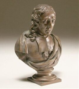В отношении бюста, изображающего мужчину в парике, поиск имени прототипа привел к несомненно положительному результату. Изображен выдающийся французский поэт-баснописец Жан де Лафонтен (1621 — 1695). Характерные черты, запечатленные в бронзе, полностью соответствуют внешности писателя на портретах кисти Г. Риго и гравюрах того времени. Сыгравший важную роль в становлении французской литературы, Лафонтен в пяти сборниках «Сказок» выступил против пороков духовенства, продажности чиновников, ханжества. Поэт навлек на себя немилость Короля-Солнце, который противился избранию Лафонтена в Академию. Широкую известность принесли Лафонтену «Басни» (12 книг!), в которых его язык был ближе к живой речи, чем язык всех других французских писателей XVII века. Созданный Лафонтеном вид басни получил дальнейшее развитие во всех странах Европы и оказал влияние на русского баснописца И. А. Крылова.
