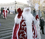 Необычно отметили последний день осени в Одессе. Колонна Дедов Морозов, Снегурочек и разнообразных сказочных персонажей во главе с отрядом барабанщиц проследовала от Думской площади по Приморскому бульвару к памятнику Дюку, спустилась по Потемкинской лестнице и завершила шествие на морском вокзале.
