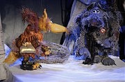 Киевский режиссер Михаил Яремчук «упаковал» этот сюжет в белую обертку из декораций зимнего леса (смена времен года обозначается ветками с листьями, которые прикрепляют к деревьям). Артисты тоже облачены в белое, а куклы яркие, изготовили их в столице. Художниками спектакля стали киевлянка Татьяна Торбина и одесситка Светлана Прокофьева, на протяжении сказки звучит музыка Баха, Бетховена, Штрауса и Оффенбаха. Ольга Опря играет Лису, Иван Цуркан — Золотого Цыпленка, а Дмитрий Павлов, пожалуй, самую главную роль, ведь его Волк проходит перед маленькими зрителями путь от дикого хищника до ответственного папы (пусть и приемного), который выше всякого обогащения ценит жизнь и благополучие малыша. В финале серый и его приемыш удобно устроятся в домике, сложенном из ненужных лотков для яиц, и старший расскажет младшему сказку, совсем как у людей…