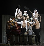 Но как же преображается на наших глазах этот темный народ, являя множественность ипостасей! Вдруг он сбрасывает ватники, оголяя торсы: мачизм под сермягой, неукротимое буйство, агрессия плоти, чреватая беспределом Стеньки и Емельки! А вот он повязывает на головах белые рубахи, заводя рукава на затылок, и перед нами уже солдаты колониального войска в жарких странах, — расшифровывать ли аллюзию? К финалу повествования народ, изъясняющийся партиями из «Аиды», вообще преобразится в древних египтян — это оправдано галлюцинациями Полякова, видениями Амнерис-возлюбленной, — и последнее превращение выведет историю Полякова в параметры вневременные, намекнув, что данная личная трагедия универсальна, ни от каких революций и властей не зависима, и что все, называемое нами «культурой» и «вечными ценностями», на деле весьма относительно и человека от вселения беса не спасает…