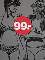 Название экспозиции, состоящей из живописных работ, отсылает к популярному немецкому журналу — «Некермания». И на картинах видим подобие рекламы красивой жизни и красивых товаров, а рядом значки, обещающие скидки — только не круглое число, непременно девятки для правдоподобия…