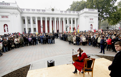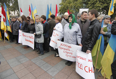 Традиционно к началу заседания перед мэрией собрались одесситы с плакатами. Кто с поддержкой мэра и мэрии, кто протестуя против отдельных решений городской власти.