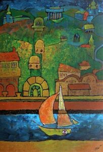 Воздушные шарики, кораблики, улицы красивых городов, висящие на веревке для просушки крохотные вещички, изображенные в стилистике детской книжной графики (хотя в экспозиции есть и живописные работы акрилом, отличаются они от графики только техникой исполнения) согревают теплыми, яркими красками. Главной темой для себя Наталья считает путешествия и города, где можно почувствовать себя путешественником из детской сказки, смотреть на мир удивленными глазами. По собственному признанию художницы, эскизы часто создаются ею на салфетках в кафе, дорабатываются произведения уже в мастерской. Работы с выставки можно сравнить с глотком вкусного чая (или кофе) вприкуску с пирожным, и никакого намека при этом на приторность, сплошной уют, покой и позитив.