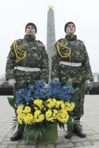 Более тысячи студентов, обучающихся на военной кафедре академии, прошли в военной форме торжественным маршем от главного корпуса на Пионерской улице до площади 10 Апреля и возложили цветы к стеле «Крылья Победы», почтили минутой молчания память погибших в Киеве.
