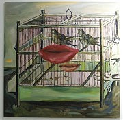 Татьяна представила картины из серий «Архитектурные украшения» (как манящие поцелуем губки «рифмуются со старинными виньетками и лепным декором!), «Путешествие» и другие. Ах, эти девчачьи хитрости, стразики, цветочки, акценты алого — не такими ли уловками женщины пытаются манипулировать миром?.. Артем экспериментирует с мотивом черной дыры, которая неожиданно становится точкой опоры в одноименном диптихе, где из одного пятна-воронки веером расходятся человеческие тела. Строго, монохромно, мужественно. Здесь все в гармонии начал, как и в хорошей семье.