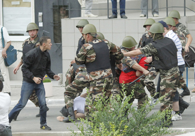 После очередного всплеска эмоций ситуация вроде бы стала успокаиваться. И тут произошел ключевой момент всей этой истории. В рядах вояк в хаки прозвучала команда: хватай тех, кто в масках. Кто стоял рядом, слышал эти слова. Вот тут-то и началась «ловля». Тех, кто сопротивлялся, действительно лупили палками. Впрочем, тех, кто попал в «плен», их товарищи старались решительно отбить. Поэтому и получилась свалка.