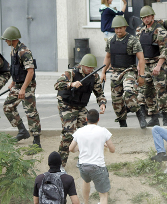 Передохнув, предприняли попытку номер два. Кто-то скомандовал: в автобус. Вернулись ребята уже с шинами в руках. И вновь попытались с этим грузом прорваться к амбасаде. Им опять не дали этого сделать. Правда, на помощь милиции пришли люди в черном камуфляже и суровые бойцы в хаки и касках. Однако вновь никто из митингующих задержан не был.