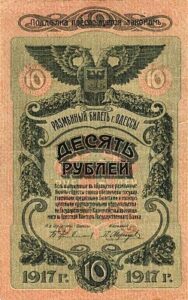 13 марта 1918 года «муравьевщина» благополучно закончилась и одесситы вздохнули с облегчением. Но тут же в город вошли немецко-австрийские войска… Наравне с одесскими деньгами начали «ходить» германские марки, австрийские кроны. По-прежнему расчеты велись императорскими «николаевками», временными «керенками», гривнями Симона Петлюры, которые были внушительного размера и отличного качества. Хуже выглядели карбованцы, за исключением тысячной купюры. Их называли «лебидь-юрчиками» по фамилии директора «ДержавноЇ скарбницi», чья подпись стояла на купюре. Были в ходу белогвардейские «колокольчики», на которых красовался «Царь-колокол».