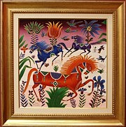 — Америка любит успешных! — восклицает Тимохова. — Тому примером Энди Уорхолл, Сальвадор Дали. Горбачев создал красочные этикетки водки «Столичной», водки «Абсолют», это бренд России, подобно тому, как Уорхолл сделал суп «Кэмпбелл» брендом США… К мобильности и трудоспособности Юрия судьба прибавила дар очаровывать людей. Да, он любит красоваться в обществе. Его картины — отражение его внутреннего мира. Если Казимир Малевич признавался, что в его душе — ночь и рисовал черные квадраты супрематизма, то у Юры в душе солнце… Классифицировать стиль этих картин всегда трудно, это вызывает споры профессионалов. Искусство Юрия Горбачева вписывается в поп-арт, имея свою нишу в виде фолк-арта. Юра придает звездность образам русской зимы и жаркого балийского рая, по его картинам скачут кони — символ силы, порхают птицы — символ свободы… Эти золотые картины и сами переносят нас в райские кущи…