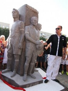 И вот — ответственейший момент: открытие скульптурной композиции, посвященной трем «звездам» украинского футбола, трем обладателям Золотого мяча — Олегу Блохину, Игорю Беланову и Андрею Шевченко. Право снять покрывало, скрывающее скульптуру, было предоставлено заслуженному мастеру спорта, бывшему игроку одесского «Черноморца», киевского «Динамо» и сборной СССР И. Беланову.
