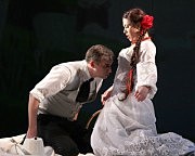 НО ЧТО ЖЕ все-таки Катерина? Ее играют, каждая в своем составе, заслуженная артистка Украины Ольга Петровская и Нинель Наточа. На начальном этапе жизни спектакля, мне представляется, в режиссерский замысел несколько точнее встроилась вторая. Именно чувством ритма: отлаженной четкостью малейших реакций на малейшее событие. В Петровской больше мягкого, плавного, от лирической героини… но давайте разберемся с лирикой.