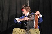 Но самое «вкусное», конечно, представление. Сперва мы видим, как рутинно можно поздравить ребенка с Новым Годом: наскоро преобразившийся в Деда Мороза папа буднично вручает деревянного коня семилетней дочери (а шесть коней уже пылятся в шкафу с прошлых праздников), и снова утыкается носом в газету. Задавленная бытом мама (непривычно грустная клоунесса Ксюня, она же Оксана Рутковская) стирает в корыте бесконечные колготки. А где же праздник?
