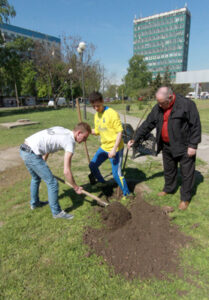 Работа на площади кипела с самого утра. Коммунальное предприятие «Горзелентрест» доставило 35 саженцев декоративных деревьев. Самыми активными участниками акции были старшеклассники расположенной по соседству гимназии № 8. Глядя на них, подумалось: когда деревья сажают с таким хорошим настроением, они обязательно приживутся!