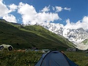Утром следующего дня, ожидая тяжелый подъем на «подушку», поднимаемся с перевала к «ночевкам» на высоте 3500 м. Там, приветливо улыбаясь, нас встречают обитатели лагеря — двое американцев с грузинским гидом. После продолжительного разговора узнаем местные новости и решаем ставить штурмовой лагерь рядом. Американцы уже пять дней ожидают благоприятную погоду: сильный ветер и регулярные вечерние грозы в этом районе идут с завидным постоянством, каждый раз стирая еле различимую цепочку следов. Нужно просто ждать.