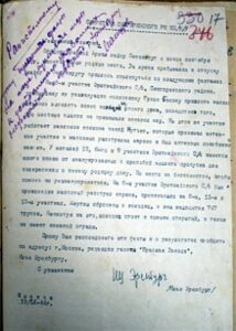 «Дорогой тов. Эренбург! Прочел Вашу статью в газете «Правда»… Меня это так тронуло, что я все время читал со слезами на глазах. Прошу Вас, если Вы будете писать про Одессу, напишите, какой кровавый ужас был в городе. 22 октября 1941 года был объявлен кровавый терорр на семь дней, фашисты днем и ночью вешали по всему городу случайных встречных или насильственно изгнанных из домов людей, не разбирая национальности… Часть людей согнали на артиллерийские склады, там их закрыли и подожгли. Других грузили в железнодорожные вагоны и обливали водой. Паровоз завозил вагоны в тупик. Люди замерзали по дороге из Одессы в местечки Яновка, Березовка и Доманевский район… Вообще немцы, румыны, русские полицейские и немцы-колонисты замечали, если у кого хорошие вещи с собой или же хорошо одеты, то их убивали по дороге и забирали их вещи…