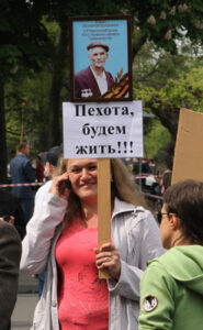 Затем, после официальной церемонии, к памятнику на аллее Славы под охраной полиции прошли участники организованной по российскому образцу акции «Бессмертный полк», с портретами родственников-фронтовиков. Некоторые портреты были украшены георгиевскими ленточками. В итоге акция, на мой взгляд, превратилась в традиционный «куликовский» митинг.