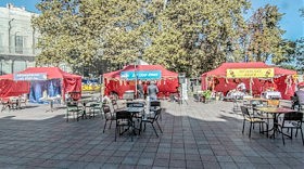 На утро 28 сентября война палаток, начавшаяся несколько дней назад на Думской площади, продолжилась. На крайней аллее над склонами стоят палатки выездной приемной нардепов Оксаны…