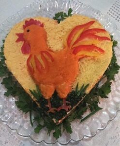 Вот и все, слоеный салат «Петя-Петушок» готов! А у вас на столе будет символ года — Огненный Петух.