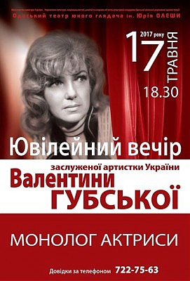 В Одесском ТЮЗе имени Юрия Олеши 17 мая, в среду, в 18.30 состоится юбилейный вечер: поэтический моноспектакль «Монолог актрисы» в честь 80-летия ведущего мастера сцены…