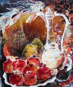 Бурлящая душа художника заставляла его в творчестве парить: не случайно ракурс в большинстве картин позволяет видеть изображенное словно из-под облаков. А изображал мастер и природу, и город, и леса, и святых, и своего ангела Ангелину на стыке живописи и графики, росчерки линий с каплями черного лака (этот глубокий цвет непознаваемости словно анаграмма, подпись художника, напоминание о черной стороне нашего бытия, на фоне которой ярче играют краски и свет). Серия картин посвящена рыбалке, сюжеты сочные, с шуткой, красочными деталями, взятыми из жизни, из многолетнего увлечения. Грустно, что красивая жизнь хорошего человека имеет конец, но в памяти учеников, родных, в своих полотнах Виктор Чернов продолжает жить.