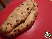 Из подготовленных смесей готовим тесто: смешиваем масло, сахар со специями, молоко с яйцами, подошедшую опару и 500 г муки. Вымешиваем тесто около 10 минут. Оно должно стать эластичным и не клеиться к рукам. Ставим тесто в теплое место для подхода примерно на 2 часа. Подошедшее тесто обминаем и вмешиваем настоянный изюм с цукатами и орехами. Делим тесто на 2 части (по количеству кексов). Раскатать тесто в 1 см в форме овала.