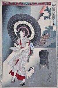 Цикл назидательных гравюр Тойохара Тиканобу называется «Двадцать четыре примера сыновней почтительности». Представлен и популярный в Японии жанр, который мы с вами теперь называем «фэнтези»: художник Цукиока Йоситоси Тайсо изобразил «Тридцать шесть новых видов привидений» (очевидно, мир призраков имеет свои модные тренды). Ну, и как же обойтись без чайной церемонии: таковая запечатлена, среди прочих быстротекущих мгновений одного будничного дня, в серии Тойохара Кунитика «Намек на 24 часа», и оказывается, наши простые будни исполнены поэзии, надо лишь уметь увидеть прекрасное в каждом мгновении, а оно неповторимо.