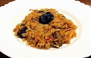 Ингредиенты: 500 г белокочанной капусты, 4 чернослива, 30 г грецких орехов, 200 мл воды, 20 г сливочного масла, сок небольшого лимона, 20 г твердого сыра, щепотка тмина.
