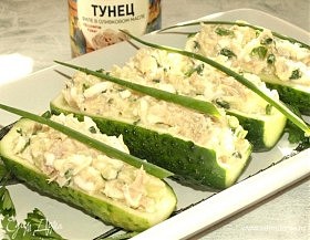 Огурцы свежие — 4 шт., яйца куриные — 2 шт., тунец консервированный — 130 г, лук зеленый — по вкусу. Заправка: йогурт натуральный — 2…