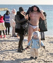 От мужской и женской раздевалок красные дорожки из нескользящего материала вели к ступенькам деревянной лестницы, к огороженной ледяной морской купели, смывающей все грехи. Священники храма после торжественной Крещенской службы провели чин освящения воды в море и церкви, где все желающие могли запастись на год целебной освящённой водой.