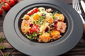 Ингредиенты: 150 г очищенной тыквы, 100 г кускуса, лук крымский (небольшого размера) — 1 шт., 100 г томатов черри, 50 г оливок (без косточек), 1…