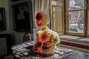 Большинство экспонатов сосредоточилось в музейном гроте, где они отлично вписались в загадочную атмосферу дворцового подземелья. Но несколько работ помещены в залах: бюст с вкраплениями из цветов эффектно просвечивается бьющим в окно солнцем, помещенная в прозрачный куб фигура словно скована оберегающими ее стенами. Фигура из мыла в полный рост подарена музею меценатом Федором Сердюком.