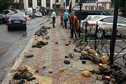 Сильнее всего от удара стихии пострадала Таможенная площадь. Расположенная в низине, она принимает всю дождевую воду с центральных городских улиц. Причем потоки воды устремляются в основном по двум узким улочкам — Польскому и Деволановскому спускам и заливают Таможенную площадь. В нынешние выходные потоки воды были такой силы, что вырывали кусками асфальт и размывали песок под ним, сдвигали и несли с собой припаркованные машины, сталкивая их друг с другом. На Деволановском спуске был вырван ливневый коллектор, и потоками воды камни, земля и куски асфальта занесло на Таможенную площадь.