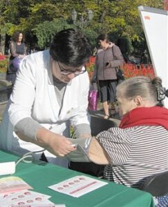 Среди зрителей встретился 73-летний Анатолий Васильевич. Профессия — инженер-механик по холодильным установкам. Участник боевых действий. Он из тех пациентов, которых хотели бы видеть врачи всех специальностей. Если что-то тревожит, не занимается самолечением, а обращается к врачам, прежде всего — к семейному врачу, с которым подписал декларацию, не откладывая в долгий ящик. Так, говорит, и здоровье под контролем, и направление к узкому специалисту своевременное. Проблемы, конечно, есть, он состоит на учете. Питается нормально, но, признается, любит жареное, сало (которое, кстати, уже оправдано). Алкоголь — самую малость, по праздникам. Не курит, в армии попробовал — не пошло, так и бросил. Одобряет подобные акции. Измерил давление, благо тут за столиками работали медсестры ЦПМСП-14 (главврач — Ирина Игоревна Кедик), ответил на вопросы анкеты, подготовленной городским Центром здоровья.