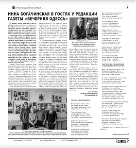 И вот на днях приходит электронное письмо, в котором сообщается, что материал из «Вечерки» опубликован в Нью-Йорке, в российско-американском еженедельнике «Репортер» (https://issuu.com/reporterru/docs/reporter-957). Под публикацию была выделена целая полоса. Очень теплыми оказались слова преамбулы к нашей публикации, громадное спасибо, коллеги, за то, что так бережно относитесь к памяти о творческом и жизненном подвиге Первого редактора «Вечерней Одессы» Бориса Федоровича Деревянко.