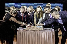 В завершение торжества на сцену вышли все сотрудники Генерального консульства Румынии в Одессе и дружно разрезали огромный праздничный торт выполненный в цветах национального флага.