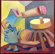 — Валентин Лапшин хочет продемонстрировать свою заинтересованность обликами современников, которые отличаются от геометрических фигур своей рельефностью, — комментирует экспозицию Наталья Симонова. — Они изображены, словно «витрины» новой современной действительности, в которой предметы-конструкции уже утратили свою актуальность. Художник хочет найти свою ауру форм человечности, отойти на расстояние от идей конструктивизма, найти свой язык трансформации мира. Преобладающий желтый цвет в картине — скорее, предупреждение, чем символ солнца и божественной власти, настраивающий на баланс и равновесие. Свойство света вызывать определенное зрительное ощущение — извечный прием художников. Художник лаконично дополняет свою лексику букетом из сухих трав. Он, этот букетик, и есть основной проводник значения: от рационального — к иррациональному. Художник утверждает свою идею, свое право создания образа.