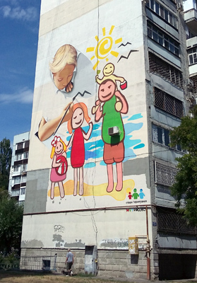В Малиновском райОне Одессы, на улице Ивана и Юрия Лип, 24, на глухой стене высотного дома появился мурал «Идеальная семья глазами ребенка», посвященный мечтам сирот…