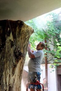 Саша Коваленко — фантастически работоспособен. При любой погоде может целый день, практически безостановочно и увлеченно трудиться. Древесный пень — материал непредсказуемый, где-то сучок, где-то труха, приходится творчески импровизировать, по ходу работы изменять первоначальную задумку. А человек он открытый, прямолинейный, добрый, с колоссальным жизненным опытом, не всегда позитивным: и за хворой бабушкой приходилось ухаживать, и за матерью. Коваленко и сам уже дед: от дочери — внучка Алина, от сына — внук Матвей, который, к слову, проявляет интерес к Сашиному инструментарию, дай-то Бог.